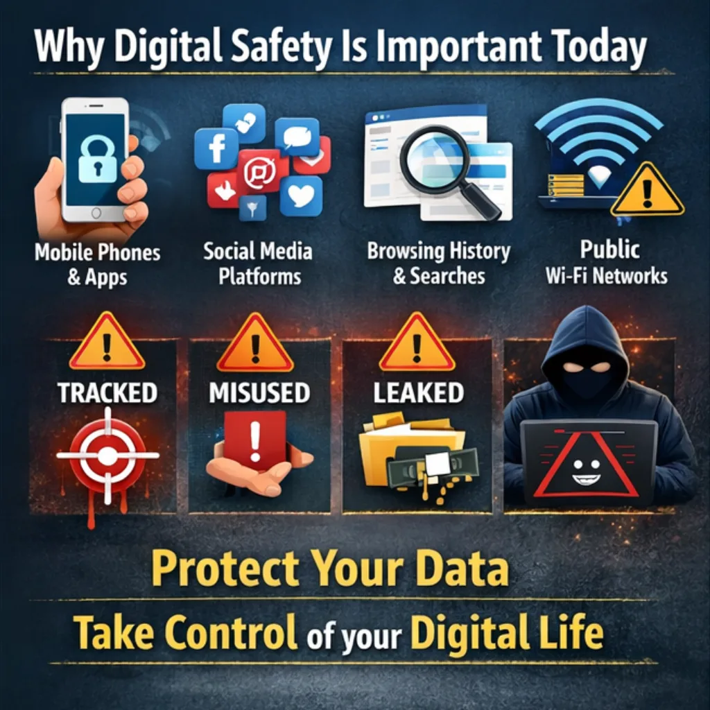 Digital safety means protecting your devices, personal data, and online activity from tracking, misuse, hacking, and cyber threats.